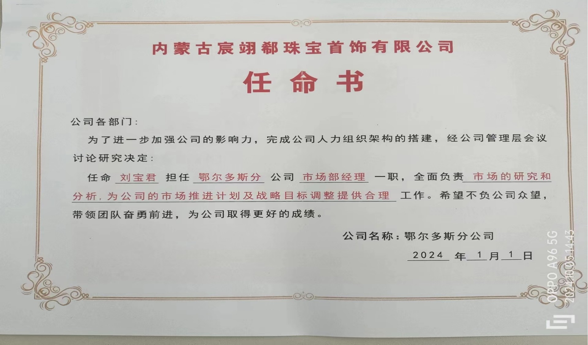 (内蒙古宸翊郗珠宝首饰有限公司给刘宝君任命书) 受访者/提供