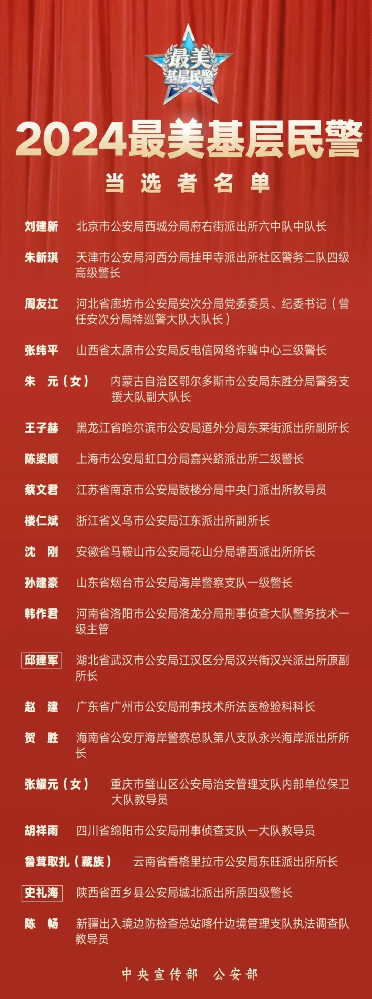 为深入学习贯彻习近平总书记关于新时代公安工作的重要论述,大力选树宣传在公安基层一线涌现出的先进典型,推动全社会形成见贤思齐、崇尚英雄、争做先锋的良好氛围,广泛凝聚建设平安中国的力量,在第5个中国人民警察节到来之际,中央宣传部、公安部向全社会发布了2024“最美基层民警”先进事迹。刘建新、朱新琪、周友江、张纬平、朱元、王子赫、陈梁顺、蔡文君、楼仁斌、沈刚、孙建豪、韩作君、邱建军、赵建、贺胜、张耀元、胡祥雨、鲁茸取扎、史礼海、陈畅等20名同志光荣当选。他们牢记使命、忠实履职,顽强拼搏、无私奉献,始终践行“人民公安为人民”宗旨,有的在打击犯罪、保护人民的关键时刻挺身而出、冲锋在前;有的长期默默无闻、甘当无名英雄,奋战在守护百姓平安的最前线;有的积极探索用科技手段赋能实战,以公安机关新质战斗力助力提升人民群众安全感、幸福感;有的长期坚守雪域高原、海岛边疆,用青春和汗水书写忠诚与担当……他们的先进事迹,集中展现了新时代公安队伍良好精神风貌和强烈责任担当。据悉,2024“最美基层民警”发布仪式专题节目将于近期播出。