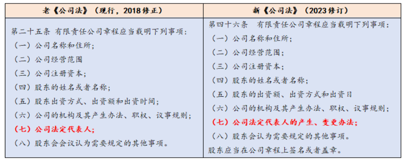 对于老《公司法》规定的“载明公司法定代表人”,结合新法“股东会认为需要规定的其他事项”,我们认为这就属于“章程选择规定”类事项。如果公司认为在章程中明确法定代表人是有必要的,就可以通过股东会决议在章程内明确;如果公司认为没有必要添加,那么就可选择性删减或不做处理。